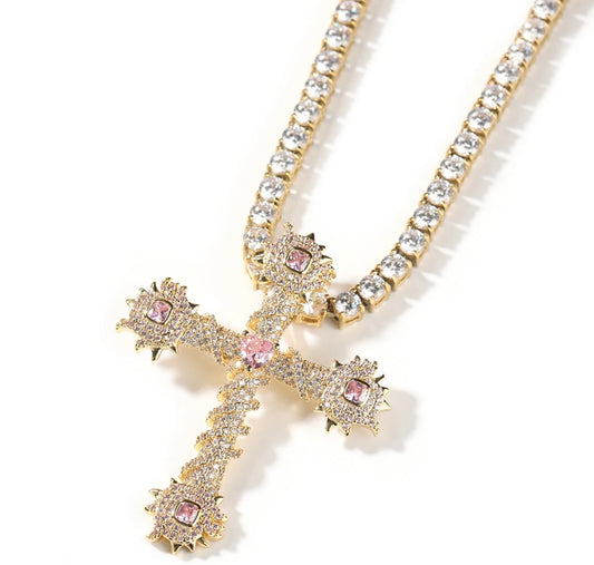TRENDY- 5.3 cm Cross pendant with pink stones