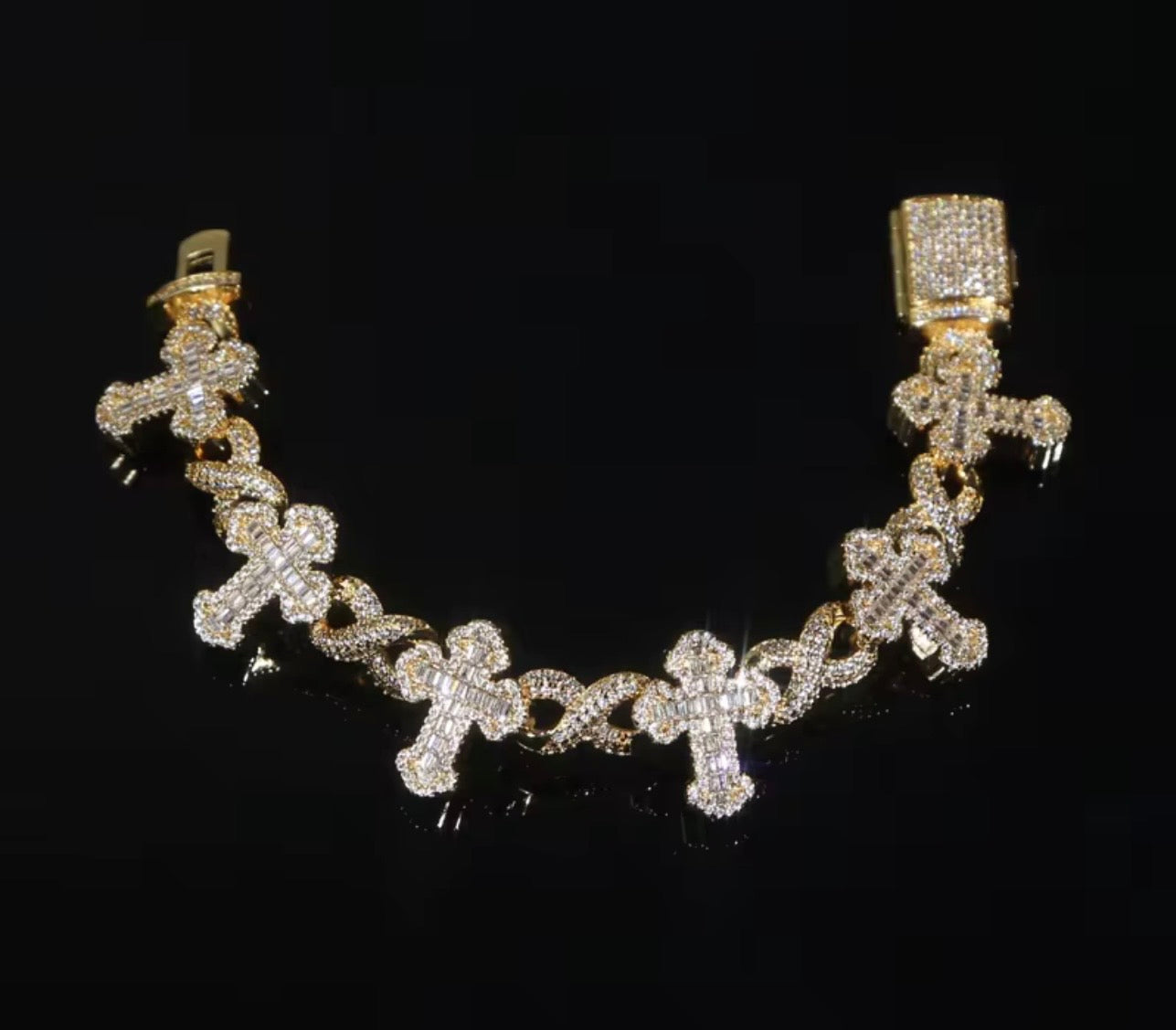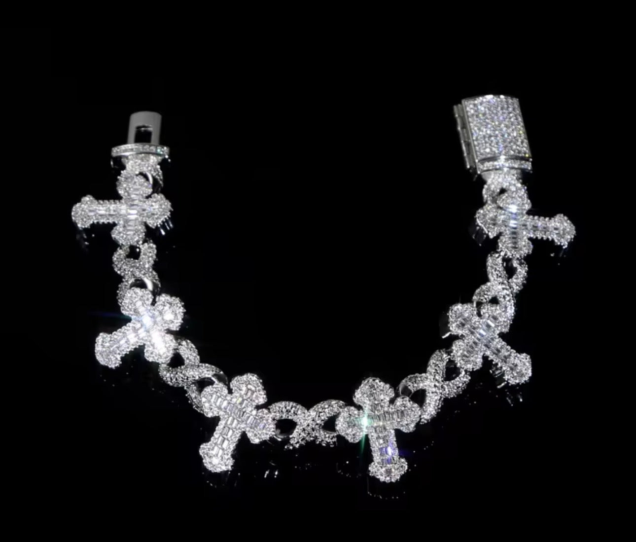 Product description: Infinity link cross bracelet. Each vertical cross is accented with baguette-style, simulated Diamonds, that catch the light from every angle. The crosses are connected by sleek, infinity links, giving the bracelet a continuous, flowing design. Finished with a secure box clasp for a realistic fine-jewelry look.