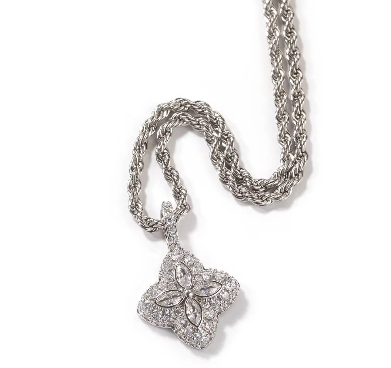 Product description: A radiant, clover pendant crafted with oversized simulated Diamond leaves, encased in a halo of fine micropavé brilliance along the outline and hook—an emblem of elegance and good fortune.