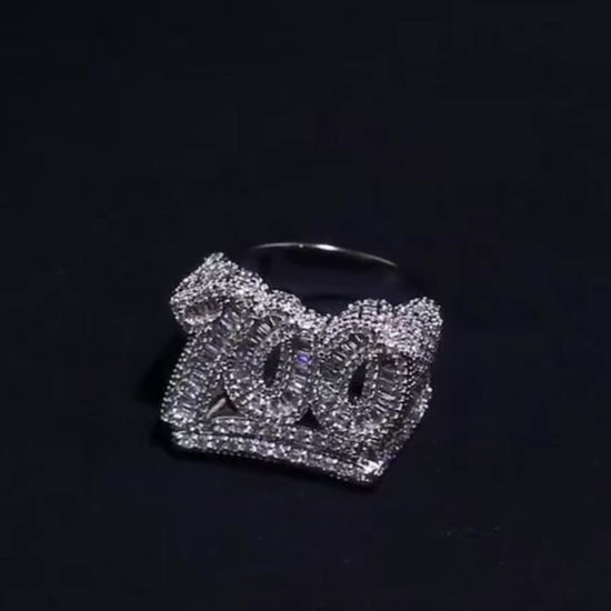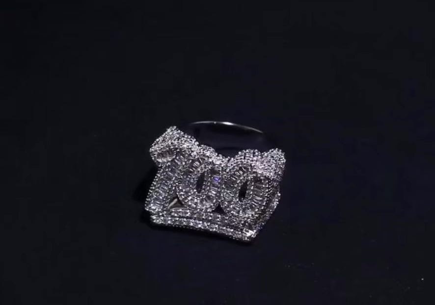 Product description: This trendy “100” ring, features baguette style, simulated Diamonds making up the “100” sign and smaller, round, simulated Diamonds as the border and around half of the band.