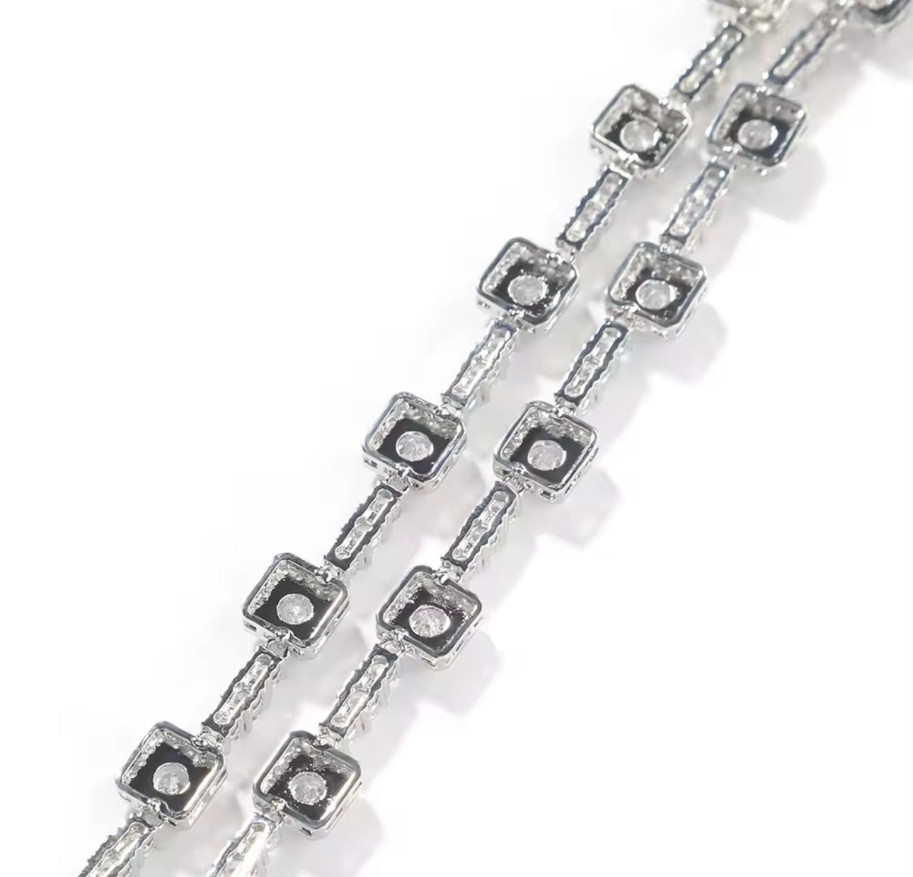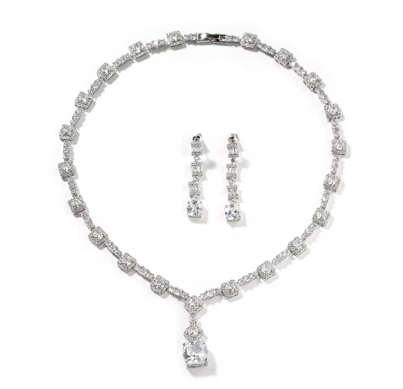Product description: Vintage-Inspired Tennis Chain Necklace Set. This elegant jewelry set showcases a vintage-inspired design with a modern edge. The tennis-chain-style necklace features interconnected, square links, leading to a striking round centerpiece, accented by a shimmering border of smaller, round stones. A graceful, dangle detail adds movement and sophistication, making this set perfect for both special occasions and statement styling.