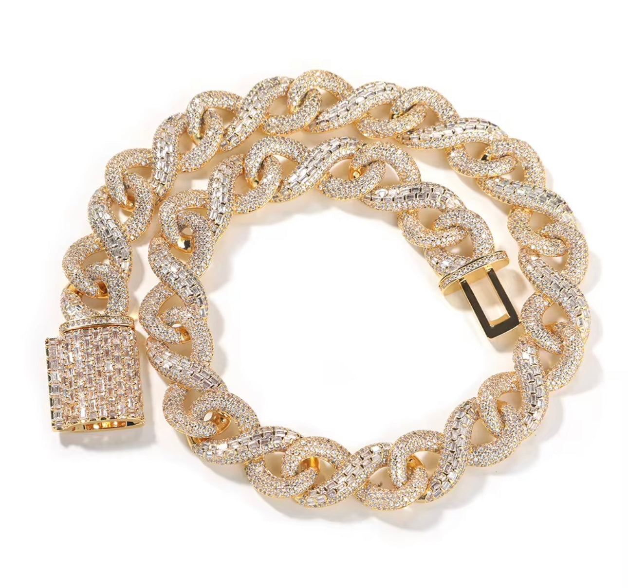 Product Description: Iced infinity link chain. Timeless, with a street edge. Features Baguette-style, simulated Diamonds flooding one half of the infinity symbol and a clean micropavé finish on the other half. Finished with a secure box clasp lock for an authentic, high-end look.