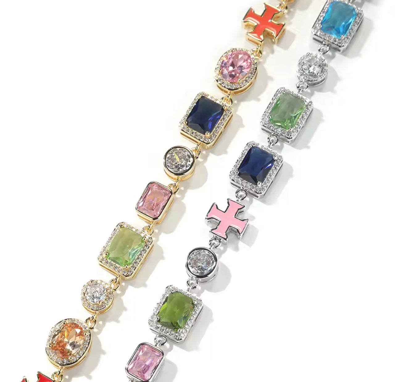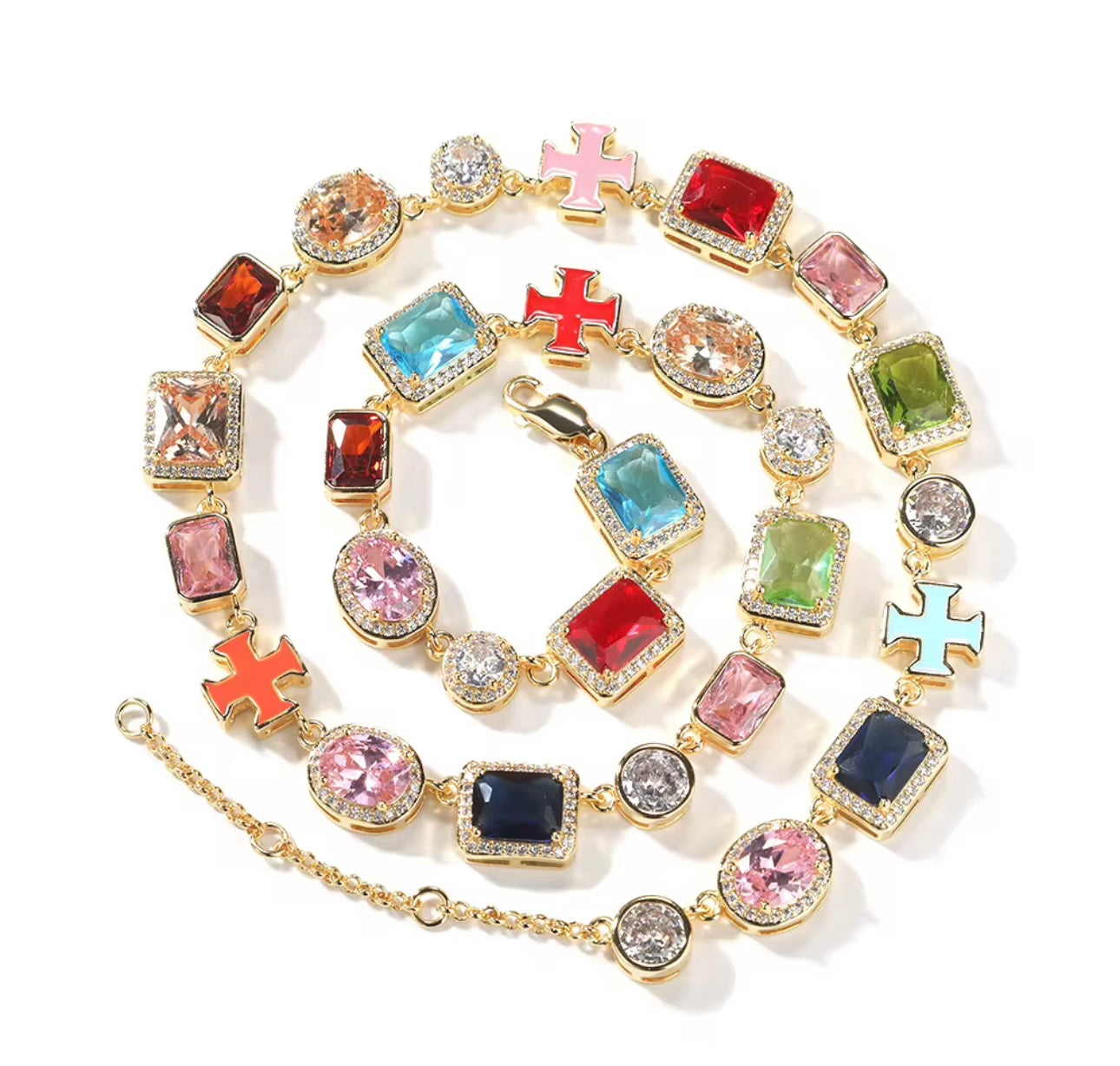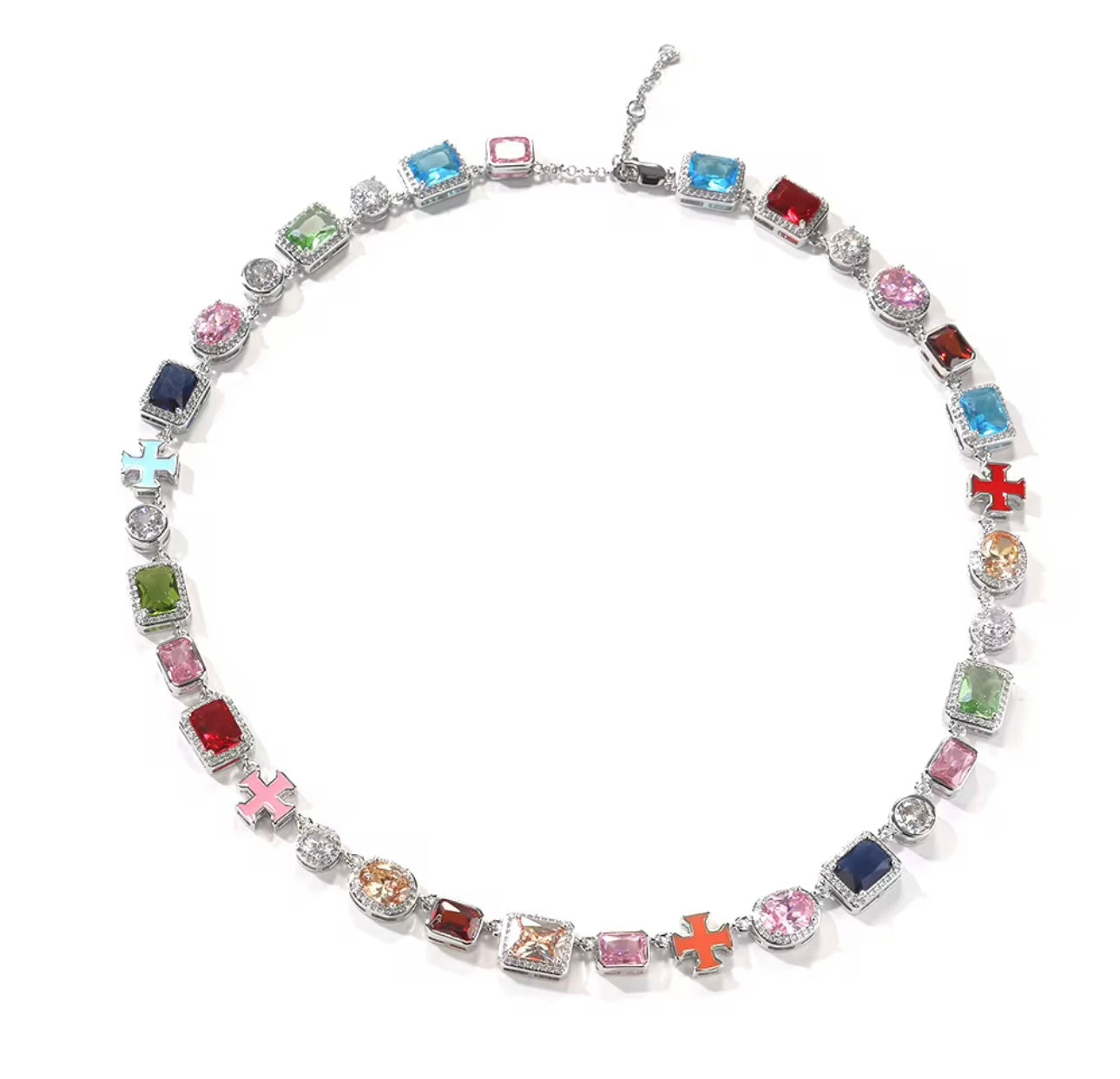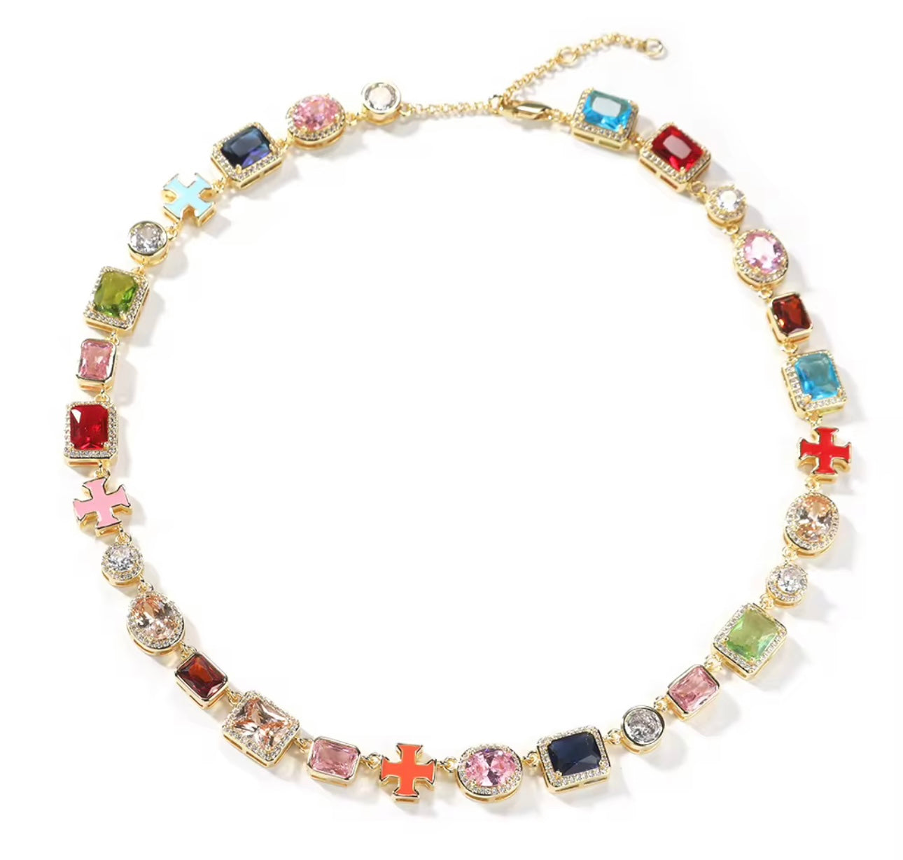 Product description: A unique necklace, with a mix of simulated gemstones & crosses. Features vintage, mini crosses, with colorful enamel and a mix of different size, round and rectangle simulated gemstones. Each gemstone is outlined with small, round simulated Diamonds.