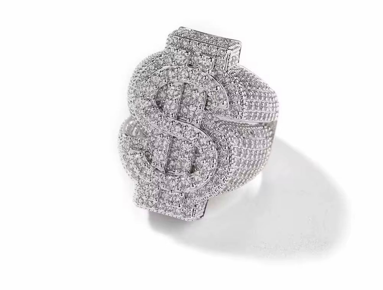 Product description: This trendy dollar sign ring, features simulated diamonds on the entire dollar sign and half of the band.