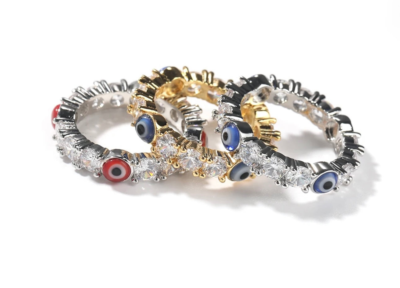 Product description : Luxury tennis ring. Features round simulated stones, with your choice of blue or red evil eye.