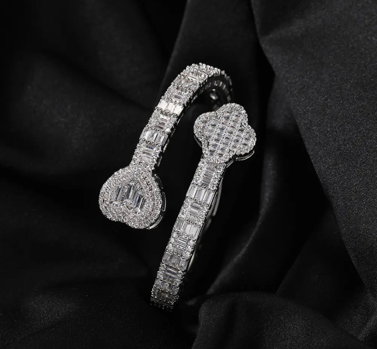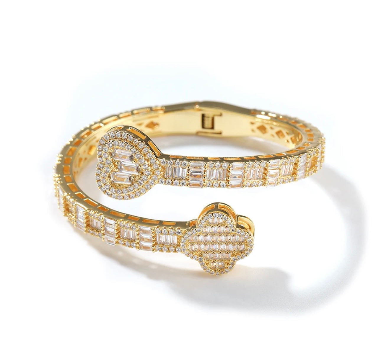 Product Description: This bangle bracelet is encrusted with baguette simulated diamonds around the entire band. Features a heart on one end and a clover on the other end.
