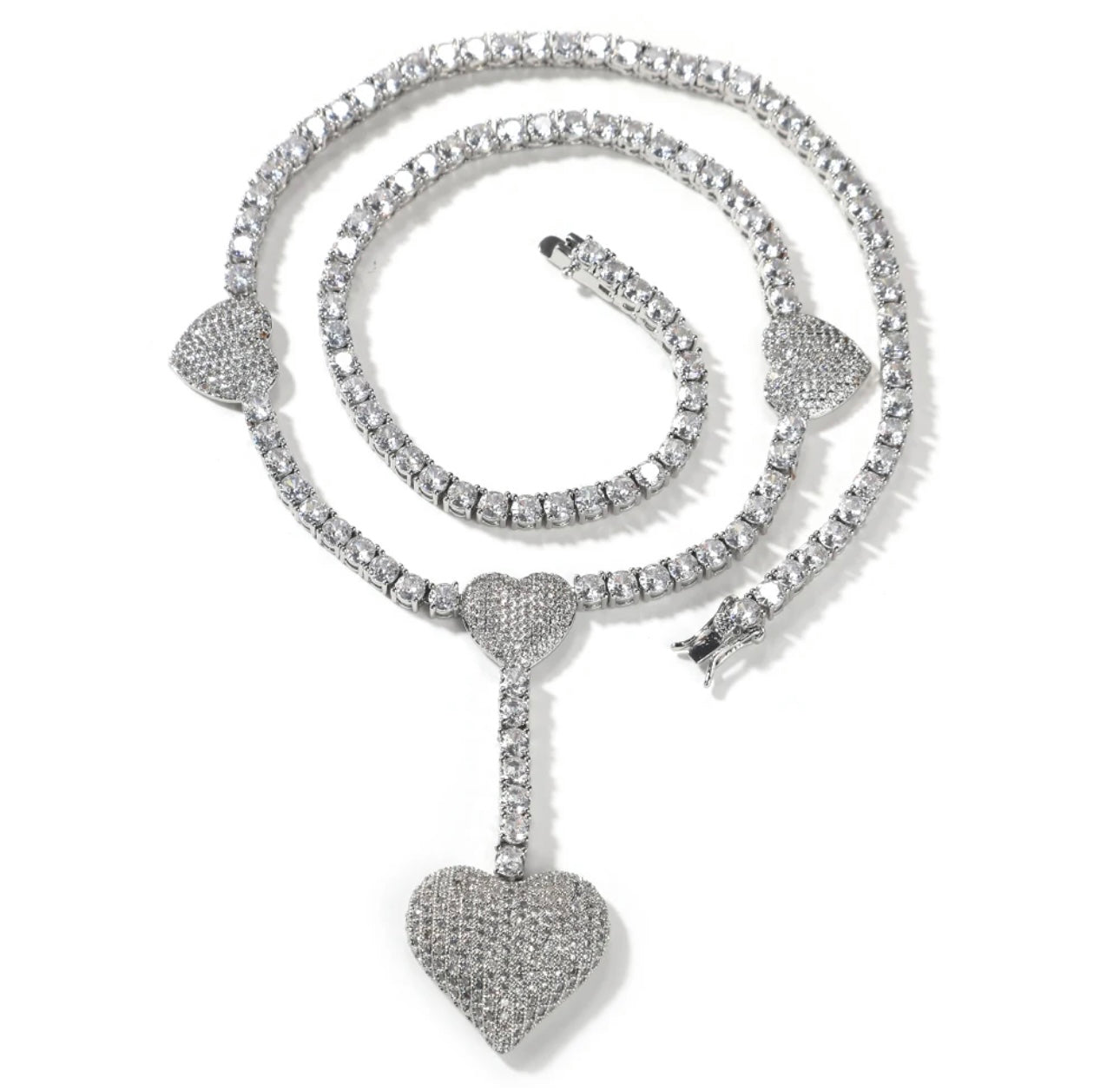Product description: 4 mm, micro- paved, heart tennis chain. Features three smaller hearts, delicately arranged around the bottom of the tennis chain and one large heart in the center, as a dangle design.