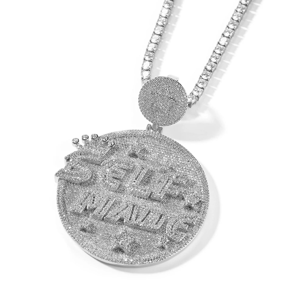 Product Description: Fully encrusted, round pendant. Features the 3D words “Self-made”, with a crown over the S, stars in the empty space and an icy, round hook, with a star in the center. Includes a rope chain; pairs well with all of our chain options.